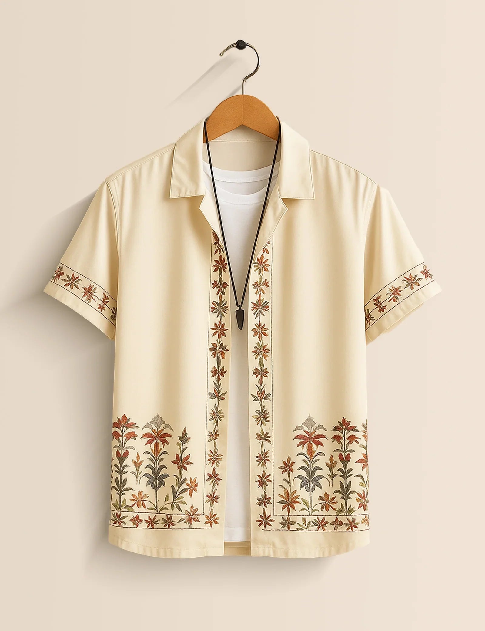 Men's Cream Floral Embroidered - Printed Half Sleeve Shirt